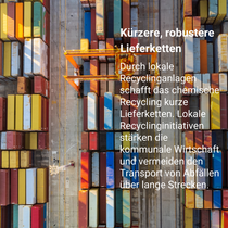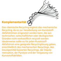Allerdings muss jeder neue Recyclingprozess sowohl vom Markt als auch von den Regulierungsbehörden als Recycling anerkannt werden. Derzeit sind noch einige technische, wirtschaftliche und regulatorische Fragen offen. Wir arbeiten eng mit den relevanten Parteien zusammen, um diese Herausforderungen anzugehen.