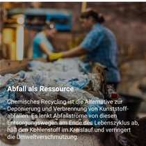 Ein Schwerpunkt unserer Aktivitäten ist das chemische Recycling von Kunststoffen. Diese Technologie ergänzt das mechanische Recycling und kann dazu beitragen, die Menge an Kunststoffabfällen zu reduzieren, die auf Deponien entsorgt oder thermisch verwertet werden. Beim chemischen Recycling werden Kunststoffe in ihre Bausteine zerlegt oder in Grundchemikalien umgewandelt.