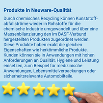 Ein wichtiger Pfeiler hierbei ist ChemCycling®. Hier konzentrieren wir uns auf Partnerschaften zum chemischen Recycling mit Fokus auf Pyrolysetechnologie. Mit dieser wird aus Kunststoffabfällen oder Altreifen ein Sekundärrohstoff, Pyrolyseöl, gewonnen. Dieses Öl speisen wir am Anfang der Wertschöpfungskette in die Verbundproduktion der BASF ein, wodurch fossile Ressourcen eingespart werden. Über einen von unabhängigen Prüfern auditierten Massenbilanzansatz wird der Anteil an recyceltem Rohstoff ausgewählten im Verbund hergestellten Produkten zugeordnet. Diese massenbilanzierten Ccycled® Produkte sind unabhängig zertifiziert und haben exakt die gleichen Eigenschaften wie konventionelle Produkte. Kunden können diese auf die gleiche Weise weiterverarbeiten und in anspruchsvollen Anwendungen einsetzen.
