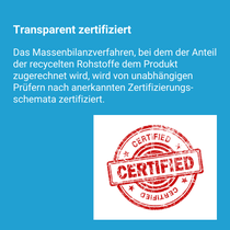 Konventionelle fossile Rohstoffe, die zur Herstellung von BASF-Produkten benötigt werden, werden durch recycelte Rohstoffe aus dem chemischen Recycling von Kunststoffabfällen oder Altreifen entlang der integrierten Produktionskette der BASF ersetzt. Der entsprechende Anteil an recycelten Rohstoffen, z.B. Pyrolyseöl, wird dem spezifischen Ccycled®-Produkt über einen zertifizierten Massenbilanzansatz zugerechnet. BASF-Standorte und Ccycled®-Produkte sind von Dritten gemäß international anerkannten Zertifizierungssystemen wie REDcert2 und ISCC PLUS zertifiziert und entsprechen den Definitionen der ISO-Norm 22095:2020. Der recycelte Rohstoff ist im BASF-Massenbilanzprodukt nicht messbar. Der PCF von der Wiege bis zum Werkstor (Cradle-to-gate) wird gemäß der TfS-Methodik sowohl nach dem Cut-off-Ansatz als auch nach dem USE-Ansatz (Upstream System Expansion) berechnet. USE berücksichtigt eine Gutschrift für die verdrängte Abfallbehandlung aus dem ersten Lebenszyklus (z.B. Verbrennung), wodurch der CO2-Fußabdruck des Produkts im Vergleich zum entsprechenden konventionellen fossilen Produkt reduziert wird.