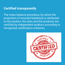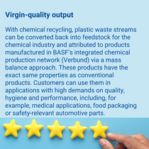 In ChemCycling®, BASF uses recycled feedstock derived from plastic waste for our broad Ccycled® product portfolio. The recycled feedstock is attributed to the certified Ccycled® products through a mass balance approach. BASF customers have successfully introduced Ccycled® products in various industries like (food) packaging, medical, textile and automotive.